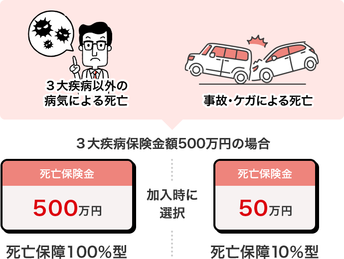 ※死亡保険金は死亡保障100%型の場合は3大疾病保険金と同額、死亡保障10%型の場合は3大疾病保険金の10%となります。
