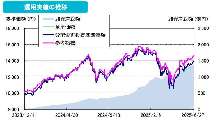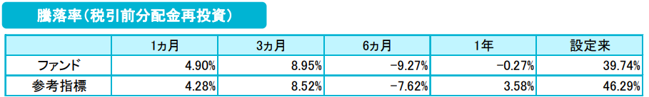 こちらのファンドは成⻑型、隔⽉決算・予想分配⾦提⽰型と2種類のファンドがありますが、今回は成⻑型の数値で解説します。直近1年で-0.27%、設定来で+39.74%の騰落率になります。
