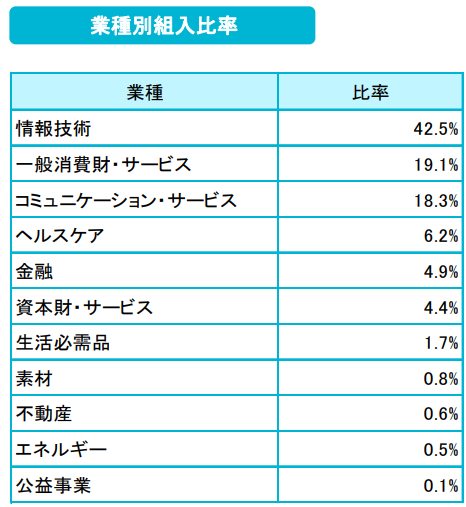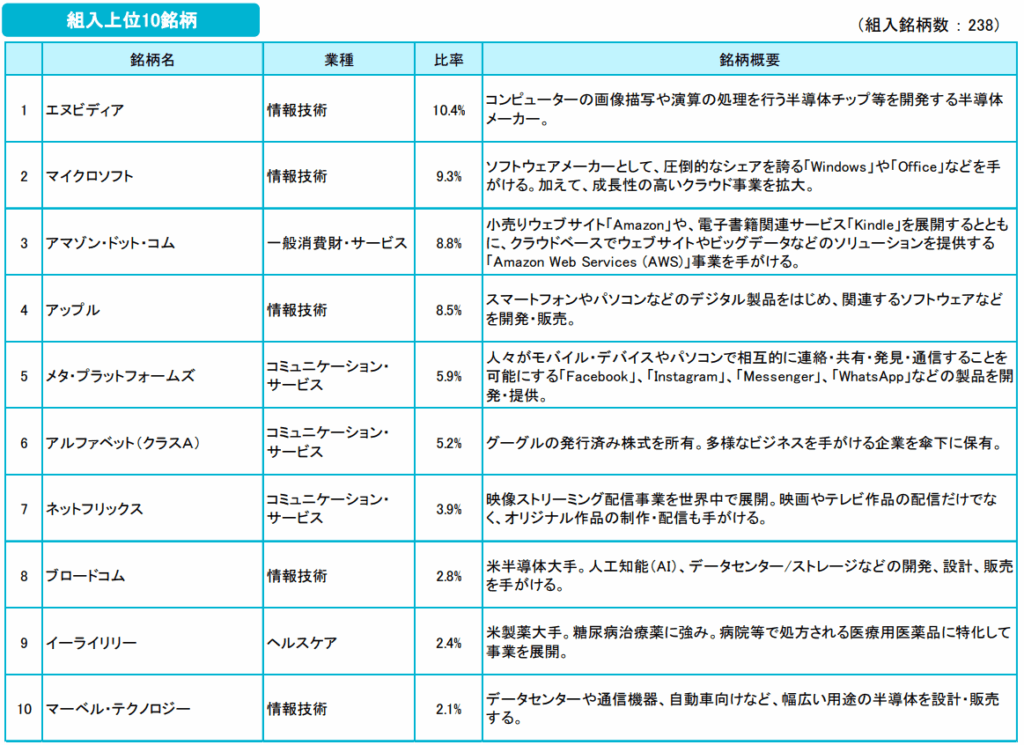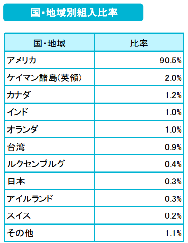 組み入れ上位はほぼ米国株で、投資割合は90%以上となっています。FANG+銘柄が多いですね。