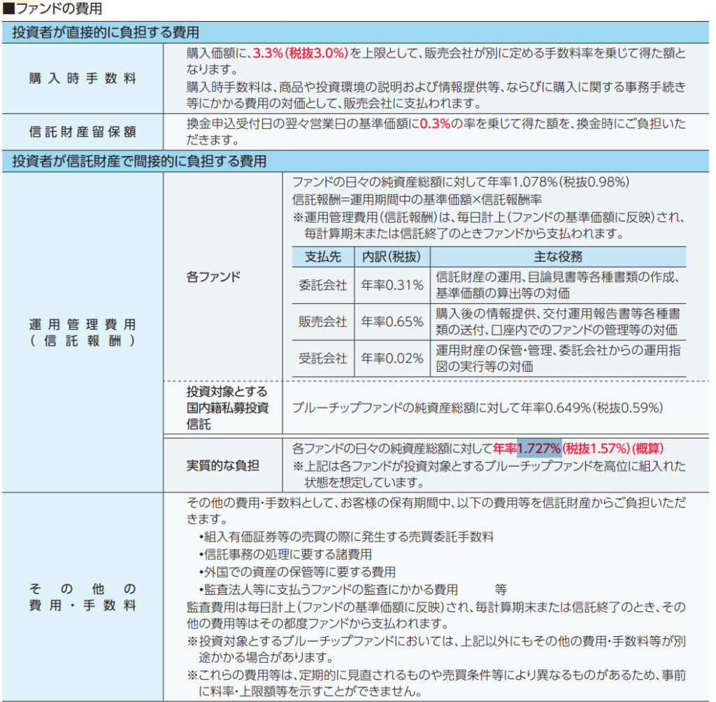 購入手数料は3.3%、解約手数料は0.3%、毎年の管理費用は年1.727%程度、その他手数料もかかります。