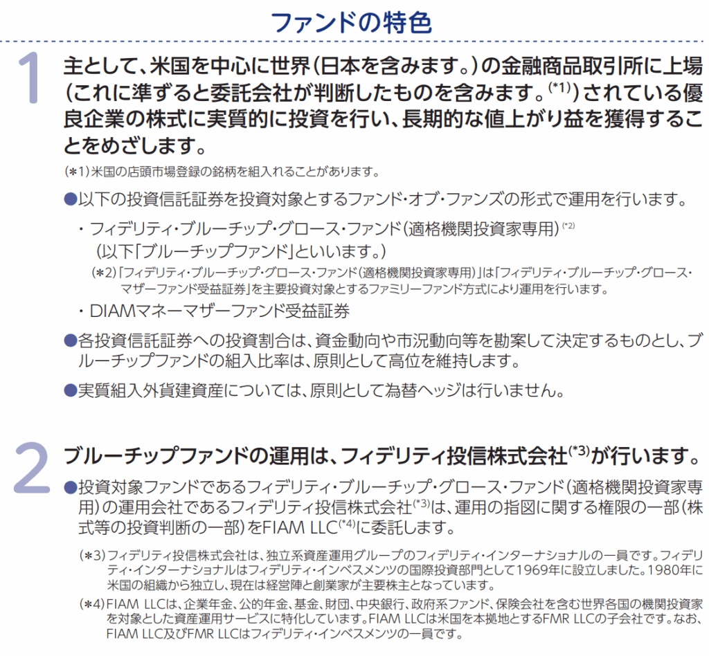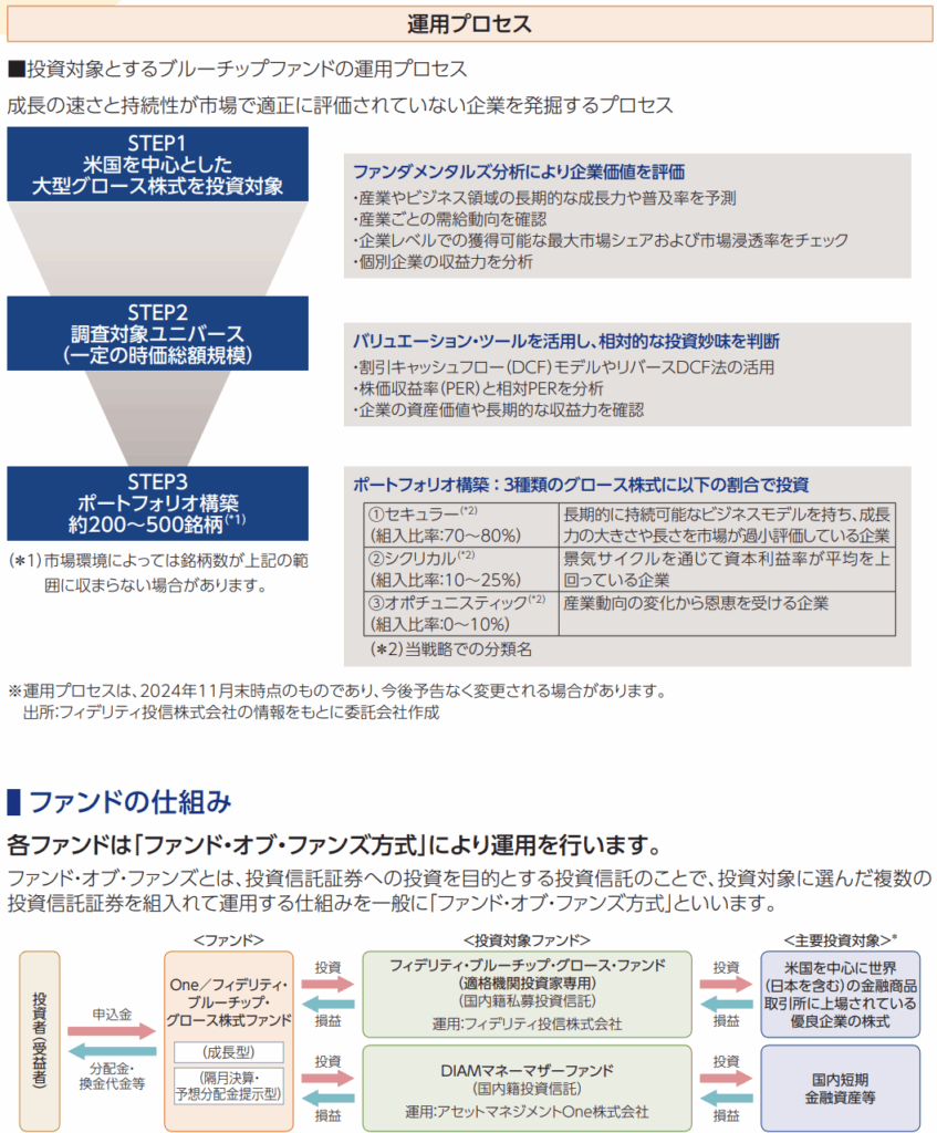 ファンド・オブ・ファンズの形式で運用し、投資先は適格機関投資家専用のフィデリティ・ブルーチップ・グロース・ファンドに投資します。投資先のフィデリティ・ブルーチップ・グロース・ファンドはフィデリティ投信、フィデリティグループの会社が運用します。
