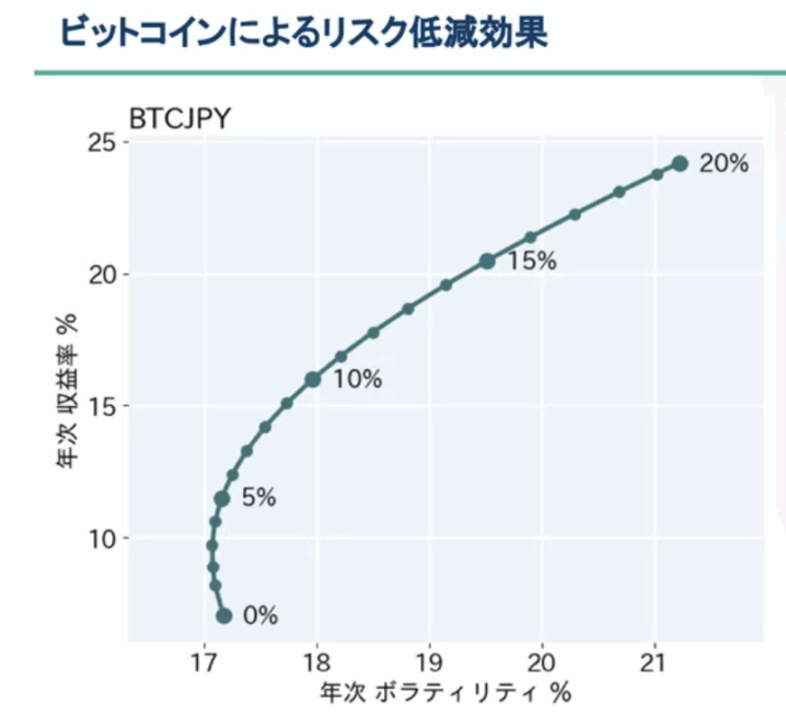 たとえば、仮にポートフォリオの中でビットコインの構成比率がわずか2%であっても、そのリスク寄与は20%前後に達する可能性があります。構成比率を10%まで増やすと、ビットコイン1つでポートフォリオ全体のリスクの約半分を担う状況となり得ます。このように、数量以上にリスクへの影響が大きいため、ビットコインを導入する際は比率だけでなく、リスク寄与の視点から慎重に検討する必要があります。