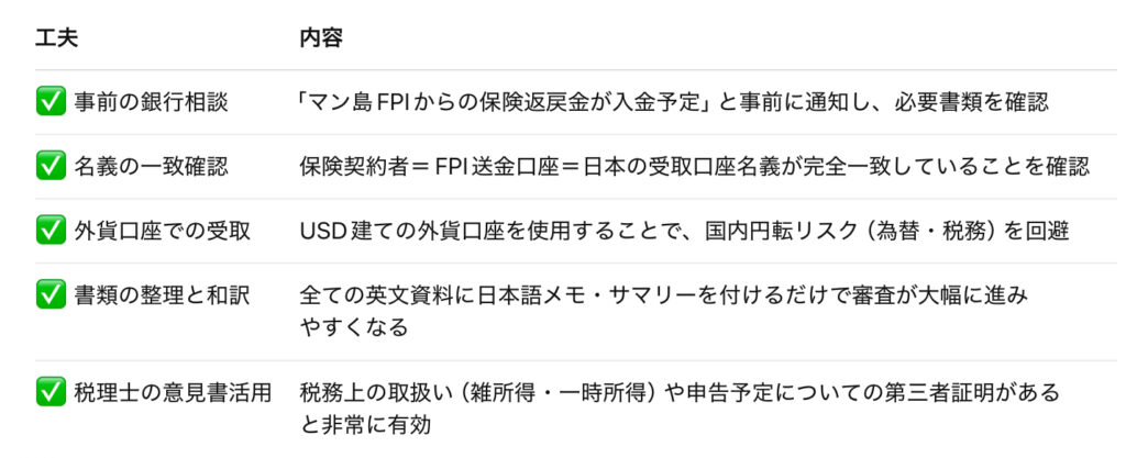 • FPIは健全なオフショア保険会社だが、日本の銀行では「税務不透明+オフショア送金」の二重リスクで着金審査が厳格化