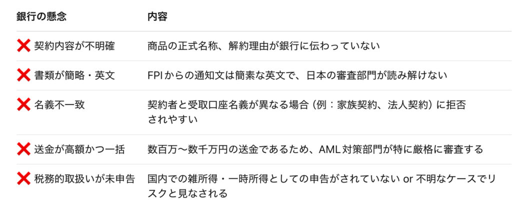 ただし、近年のFATF勧告に基づく金融庁のAML強化指導により、FPIからの送金は日本の銀行で「出所確認が困難」「投資回収か税逃れか不明確」などの理由で、着金拒否・保留対応の対象となりやすくなっている。