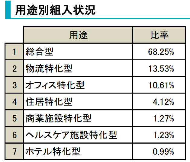 投資先は総合型が70%弱となっています。REITの総合型とは複数の種類(3種類以上)に分散するREITを指すようです。