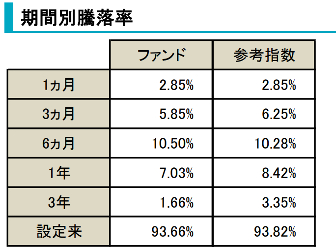 こちらのファンドは年2回決算型、毎月決算型と2種類のファンドがありますが、今回は年2回決算型の数値で解説します。直近1年で+7.03%、3年で+1.66%の騰落率になります。