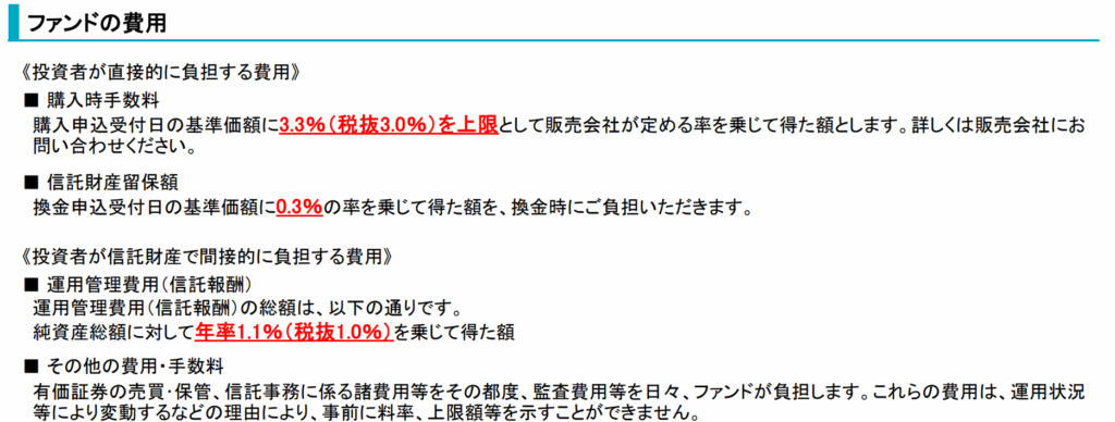 購入手数料は3.3%、解約手数料は0.3%、毎年の管理費用は年1.1%程度、その他手数料もかかります。