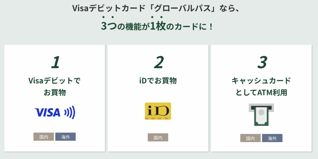 SMBCプレスティア(旧シティバンク銀行)の口座には、「Global Pass(グローバルパス)」と呼ばれるVisaブランド付きキャッシュカードが発行されます。このカードには、国内外のATMで現地通貨を引き出せるキャッシュカード機能と、Visaデビットとしてショッピングができる機能が統合されています。