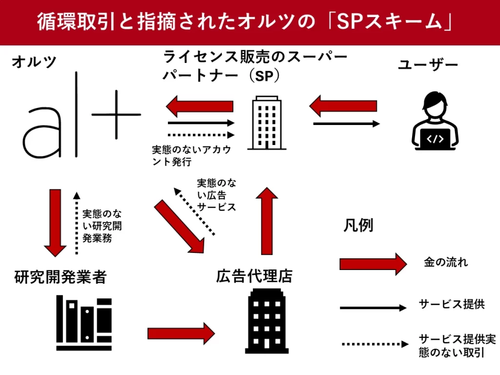 報告書によると、オルツは2021年12月期から2024年12月期にかけて、売上の約80〜90%を実態のない取引で計上していた。これらは主に「SP(スーパーパートナー)スキーム」と呼ばれる取引形態を通じて行われていた。