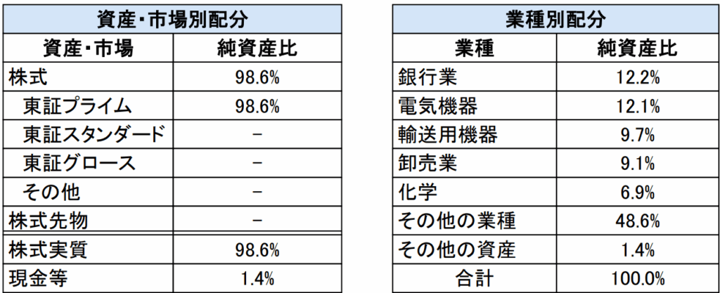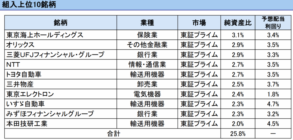 投資先上位は配当をしっかり出せる大型株のみになっていて日本を代表する企業ばかりですね。ファンド解説で触れた業種分散もしっかりできている印象です。