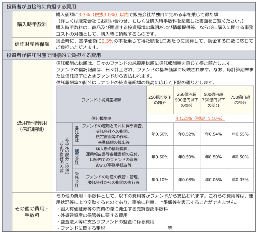購入手数料は3.3%、解約時手数料は0.3%、毎年の管理費用は年1.21%程度、その他手数料もかかります。