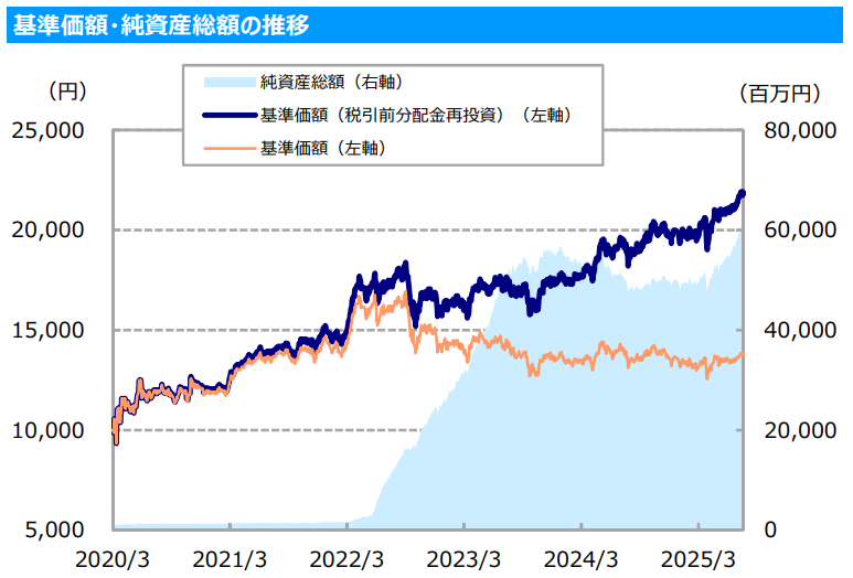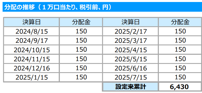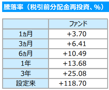 こちらのファンドは毎月決算型、年6回決算型、年1回決算型の3つのファンドがありますが、今回は毎月決算型の数値で解説します。直近1年で+13.68%、3年で+25.08%の騰落率になります。毎月決算型は毎月分配金がありますので実績を参考にしてください。