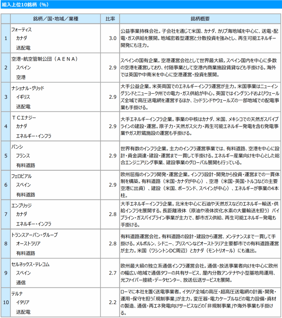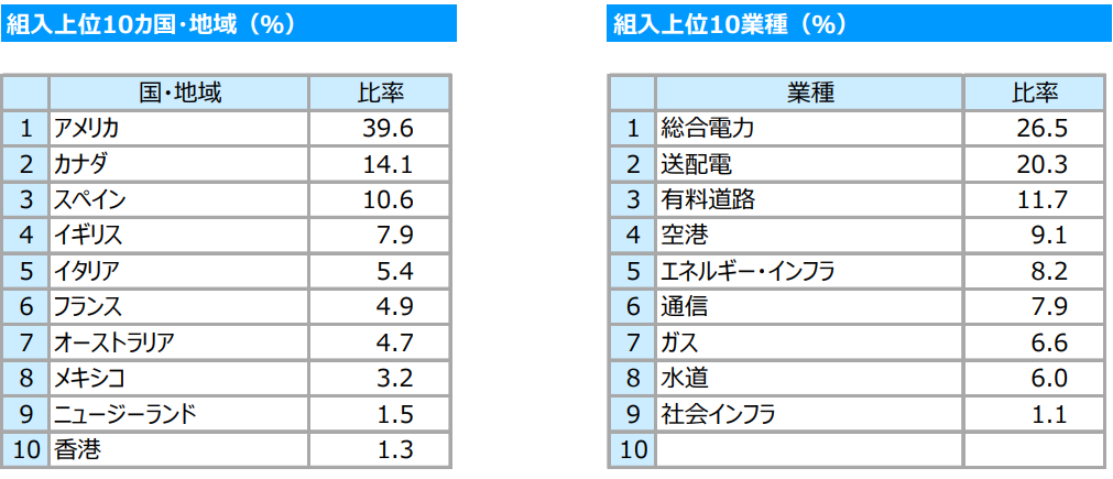 世界株にしてはかなり珍しく、組み入れ上位の国別では米国が40%弱と上位ですが、投資先上位に米国企業はありません。業種別の投資先としてはいわゆるインフラ関係が主体となっています。