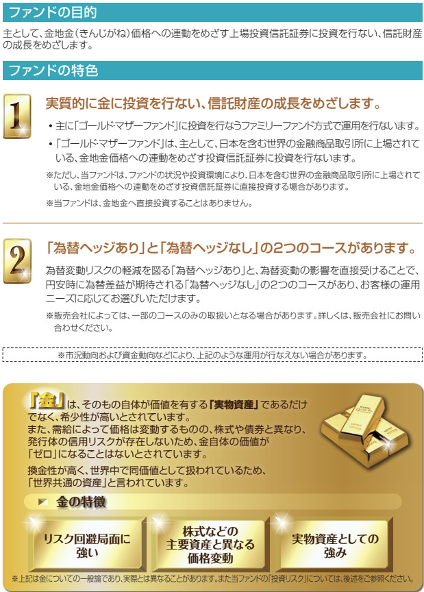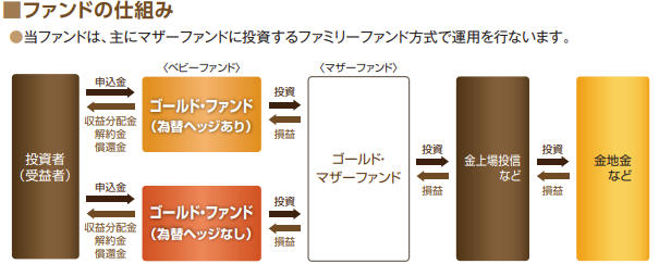 運用方針はシンプルで、世界の市場に上場している金地金価格に連動する投資信託証券に投資します。実質的に金地金に投資できる構造になっていて、為替ヘッジあり・なし2種類のファンドがありスイッチングが可能となっています。