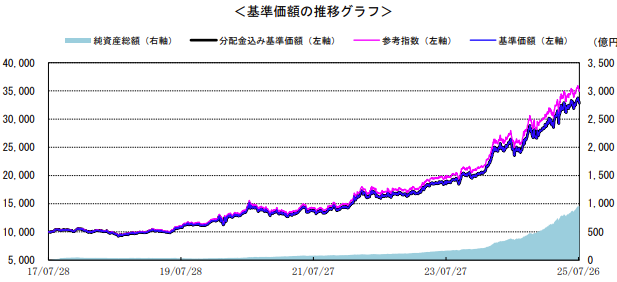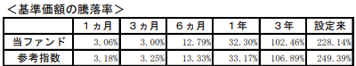 先ほど触れた通り、為替ヘッジあり・なし2種類のファンドがありますが、今回は為替ヘッジなしの数値で解説します。直近1年で+32.30%、3年で+102.46%の騰落率になります。