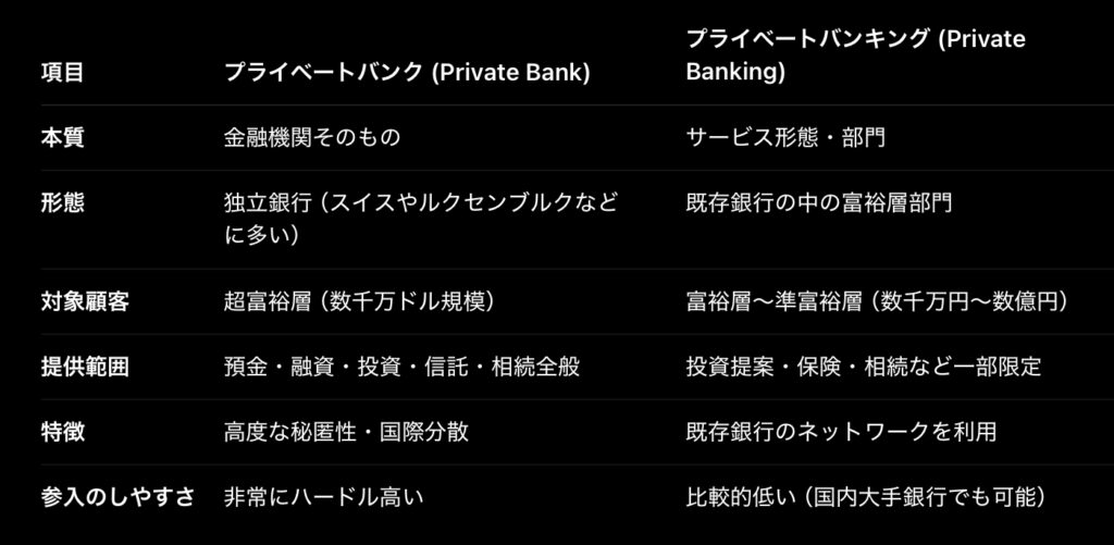 • 独立した「銀行」や「金融機関」の一形態で、富裕層の資産管理に特化。