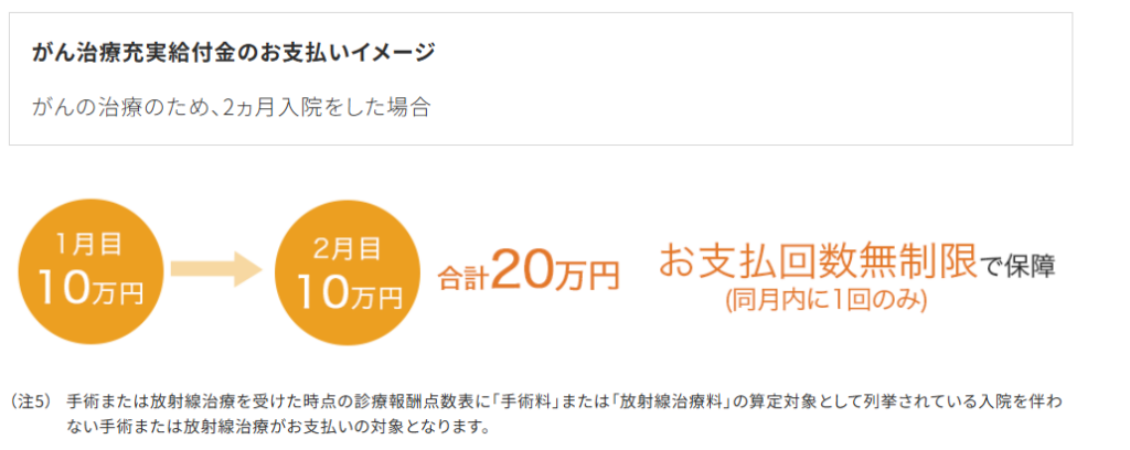 がん保険金または、がん・上皮内新生物保険金の支払事由に該当し、かつ所定の入院、手術または放射線治療を受けた時に給付金を受取れます。(受取りは同月内に1回のみ)