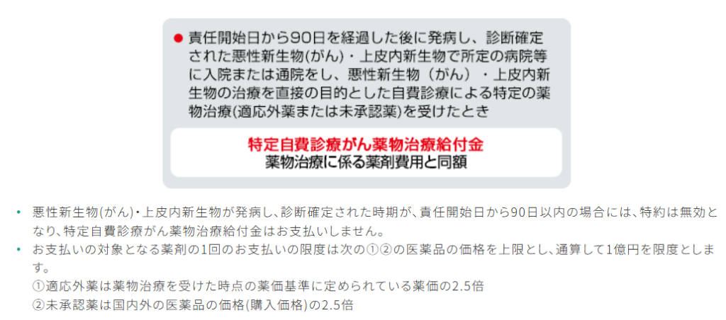 がん保険金またはがん・上皮内新生物保険金の支払事由に該当し、かつ所定の病院等に入院または通院をして自費診療による特定の薬物治療(適応外薬または未承認薬)を受けた時に受取れます。