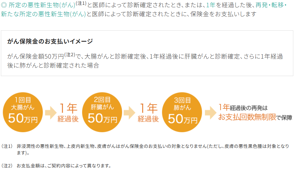- 1年経過後の再発・転移等でも支払回数無制限で一時金を受取れる