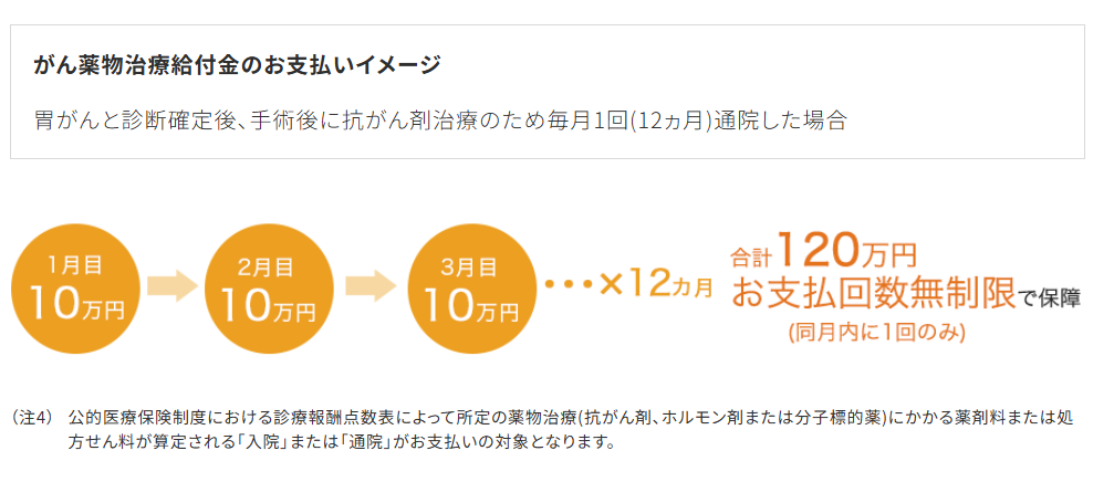がん保険金または、がん・上皮内新生物保険金の支払事由に該当し、かつ所定の薬物治療(抗がん剤、ホルモン剤または分子標的薬)を伴う入院または通院をした時に受取れます。(同月内に1回のみ)