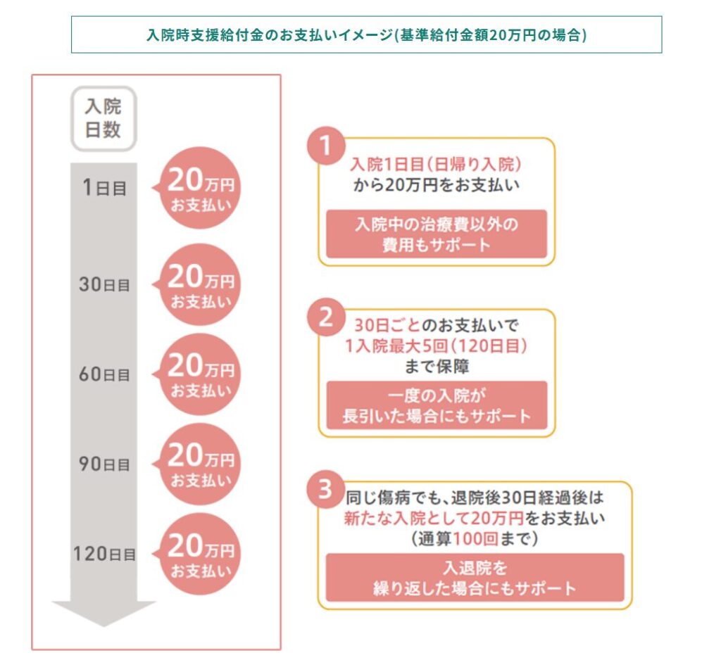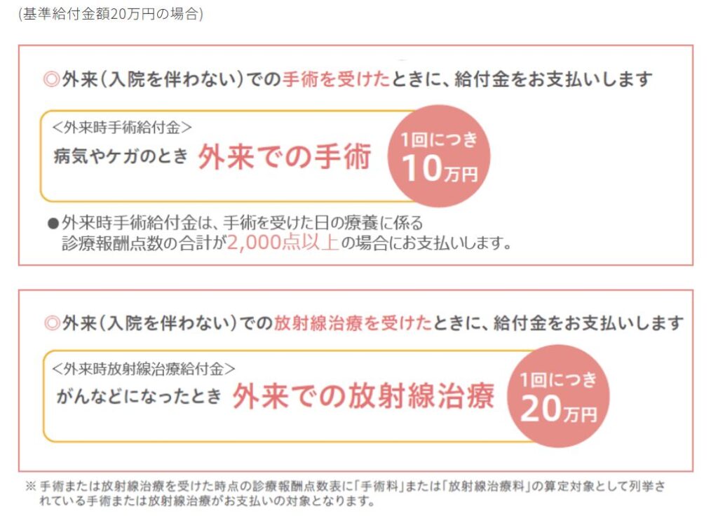 この保険は無解約返戻金型なので、貯蓄性はありません。また、入院を2回以上した場合、最初の入院の退院日の翌日から30日以内に開始した入院は入院の原因にかかわらず1回の入院とみなされてしまうので注意が必要です。外来時手術給付金・外来時放射線治療給付金の支払はそれぞれの給付金につき、施術の開始日から60日の間に1回の給付を限度としています。(支払回数は無制限)