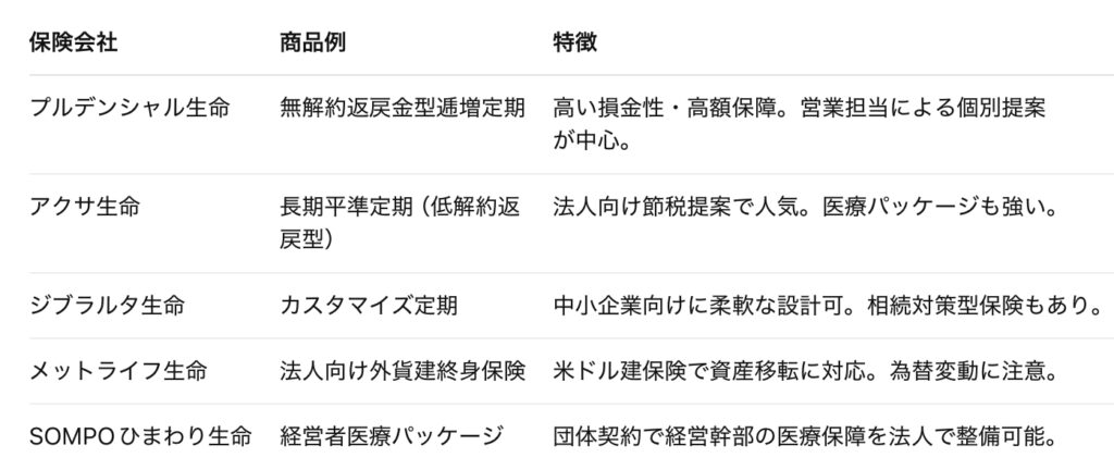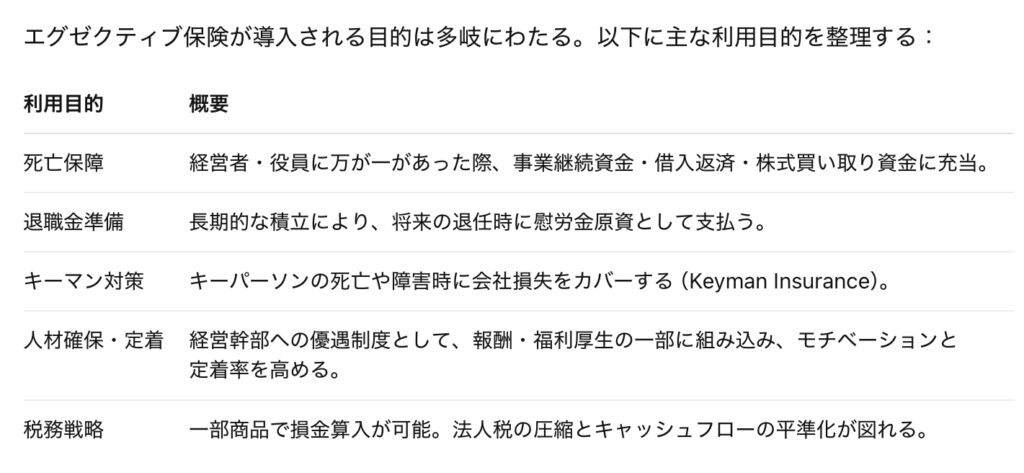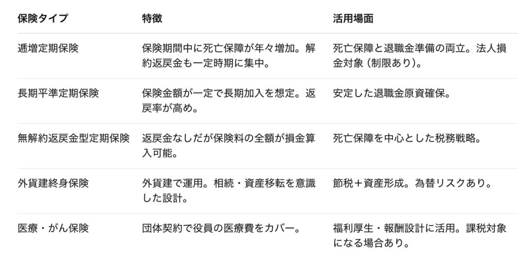 エグゼクティブ保険で活用される商品は、目的別に設計される。以上は主要な種類: