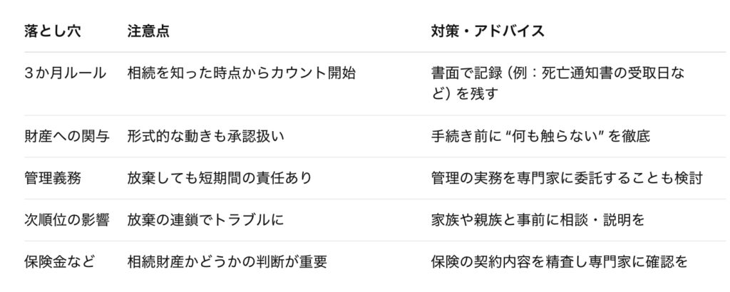 相続放棄は、借金やトラブルから身を守るための有効な制度ですが、以下のような“落とし穴”に注意しないと、かえって損をしたり周囲とトラブルになったりするリスクがあります。