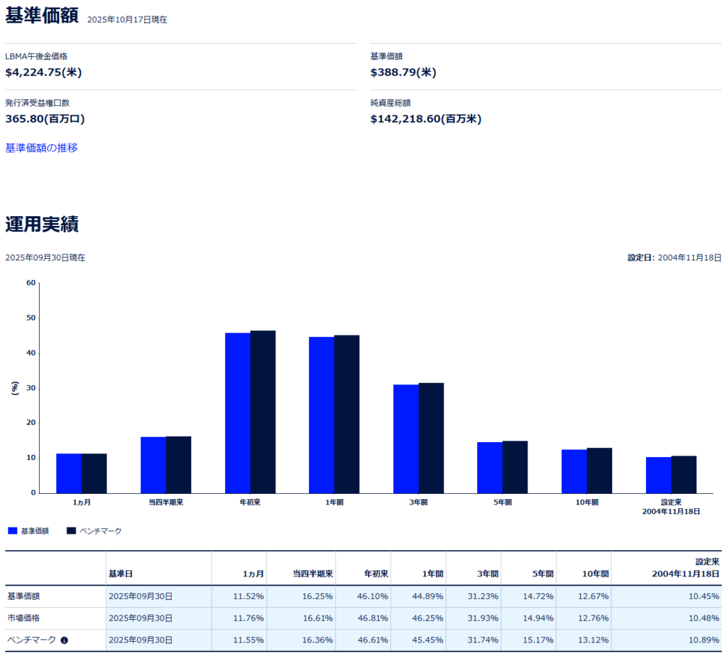 基準日2025年09月30日のデータでかつ、USDベース資料から抜粋になりますので参考にしてください。直近1年で+44.89%、3年で+31.23%の騰落率になります。