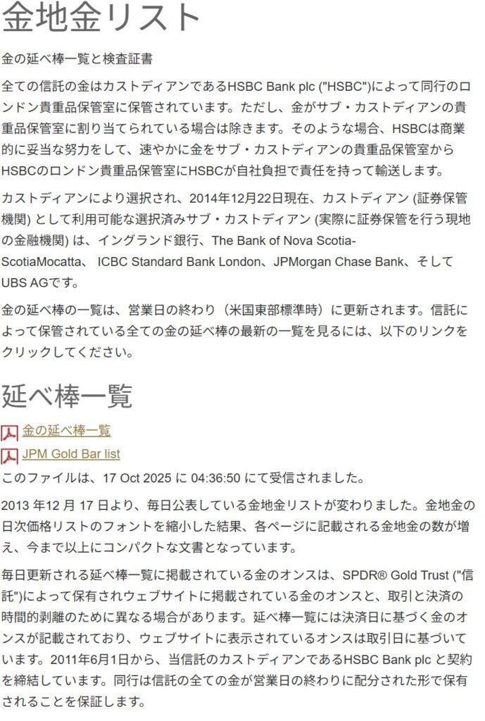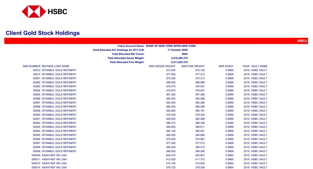 投資先の金(現物)はカストディアンであるHSBCのロンドン貴重品保管室に保管されています。参考までに一部切り取って添付しますが、リスト自体もかなりのボリュームになっています。保管される金のリストはこちらから取得可能ですが、前述の通りボリュームも多く見てもよくわからない、、となると思いますので参考としてください。