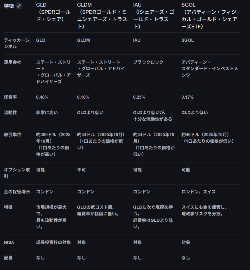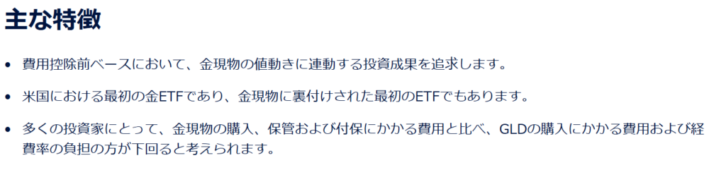 同種の他ETFと比較をするとこのようになっています。米国最初のゴールドETFだけあって後発のETFと比べると総経費率(コスト)は高いですが、高い流動性が魅力です。