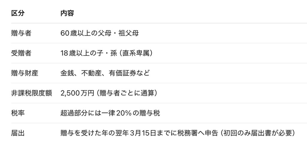 通常の贈与税では年間110万円を超えると贈与税が課されますが、この制度を選択すると、2,500万円までの贈与が非課税になります(ただし、将来の相続時にそれを含めて課税対象とする)。