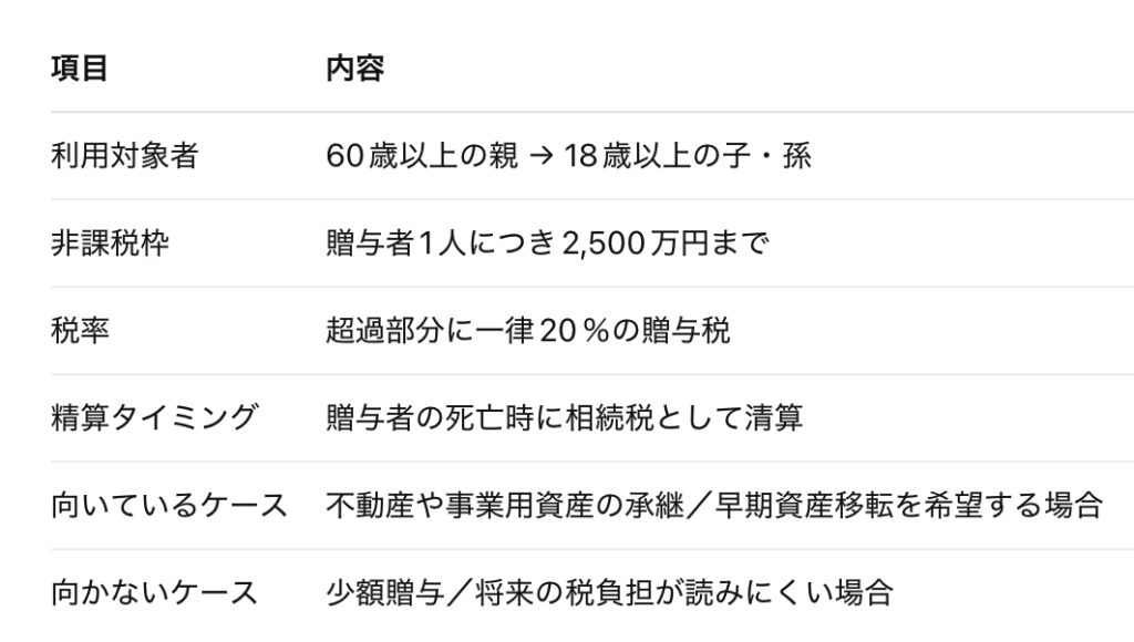 通常の贈与では110万円の非課税枠しかないため、大きな資産移転には不向きですが、この制度なら2,500万円まで非課税で移せます。不動産の生前贈与などに特に有効。