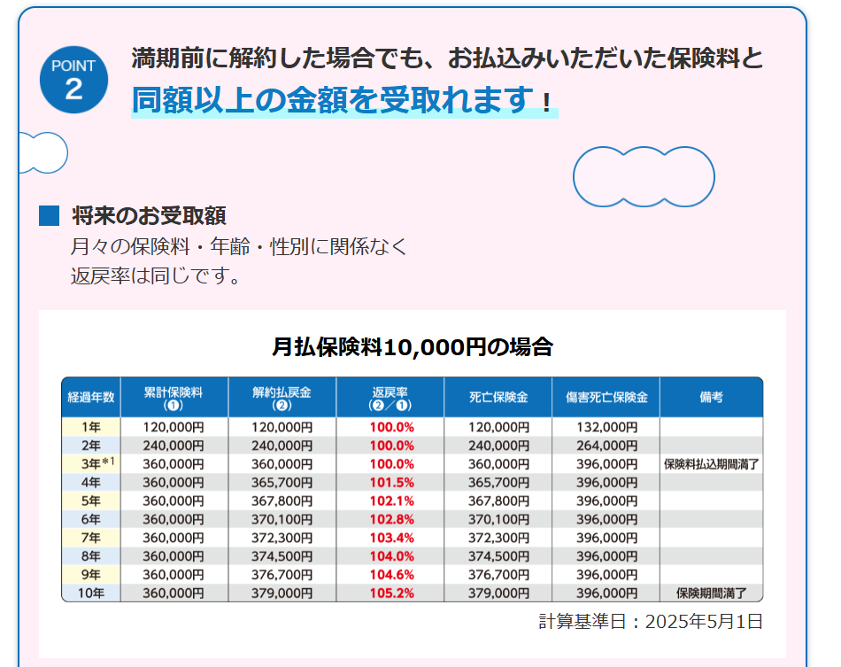 しかし、万が一の時に受取れるのは払込保険料に応じてなので、払った分の保険料が戻ってくるだけです。