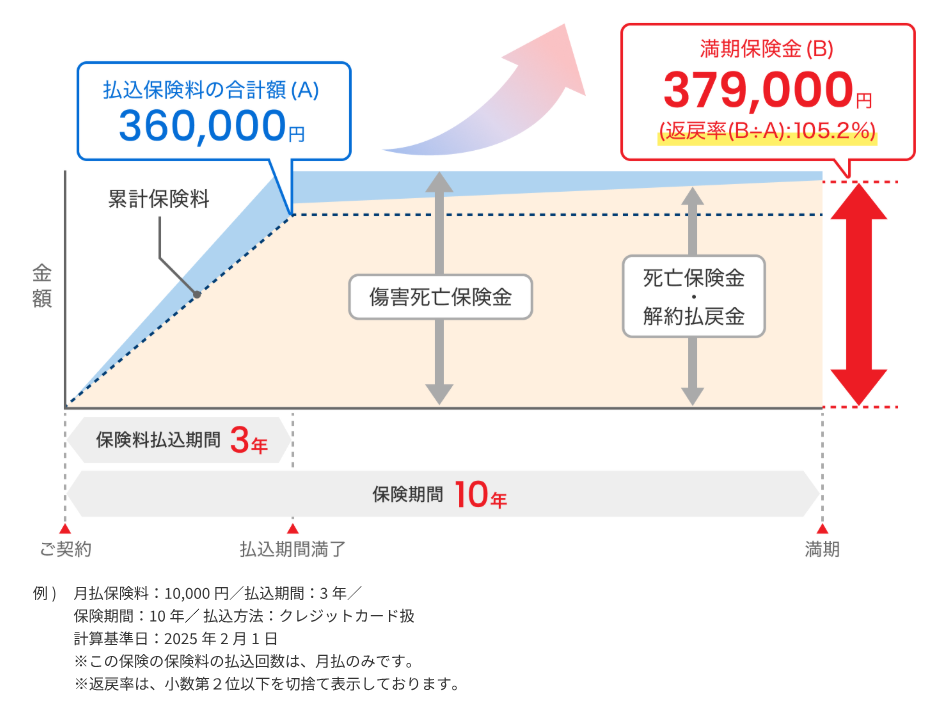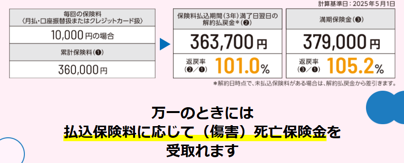 払込期間は3年、保険期間は10年という短期設計で固定利率による満期金が約束されている点が特徴です。「保険+貯蓄」を一つの商品で完結できるため、資産形成に慣れていない方や「とりあえず何か始めたい」という人には始めやすい設計となっています。