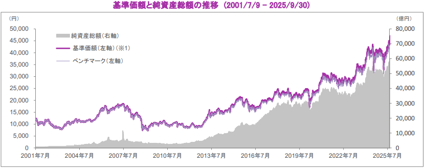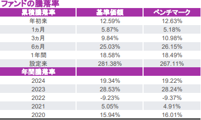 基準日2025年09月30日のデータになりますので参考にしてください。直近1年で+18.58%、設定来で+281.38%の騰落率になります。