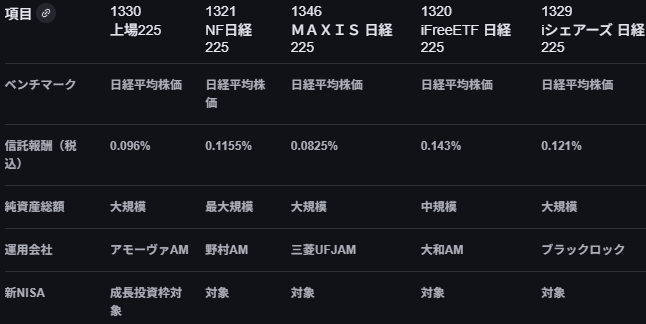 同種の他ETFと比較をするとこのようになっています。すべて日経平均株価(日経225)に連動するETFになっていますが、純資産総額と流動性は相関する為、純資産総額と手数料を考えて選択すると良いかと思います。