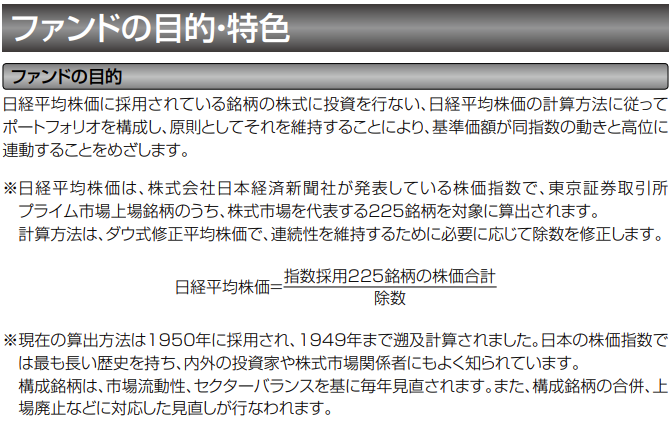 インデックスなので指数連動となり、対象インデックス日経平均株価(日経225)の値動きに連動となります。