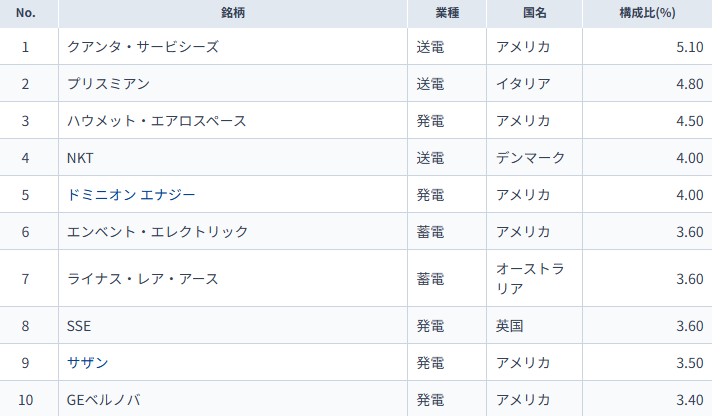 例えば、構成比率トップのクアンタ・サービシーズは送電インフラ、2位のプリズミアンは電力ケーブルの世界大手です。