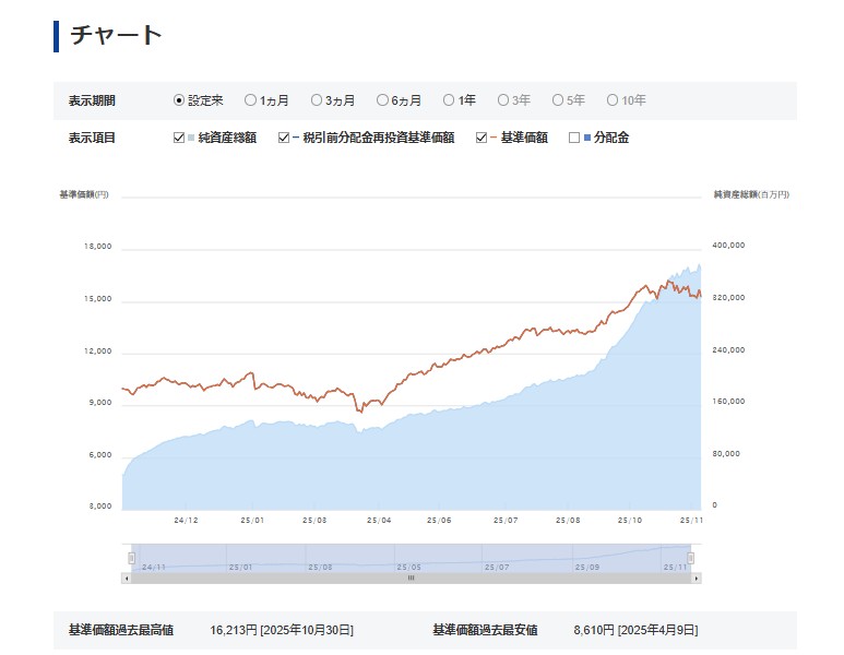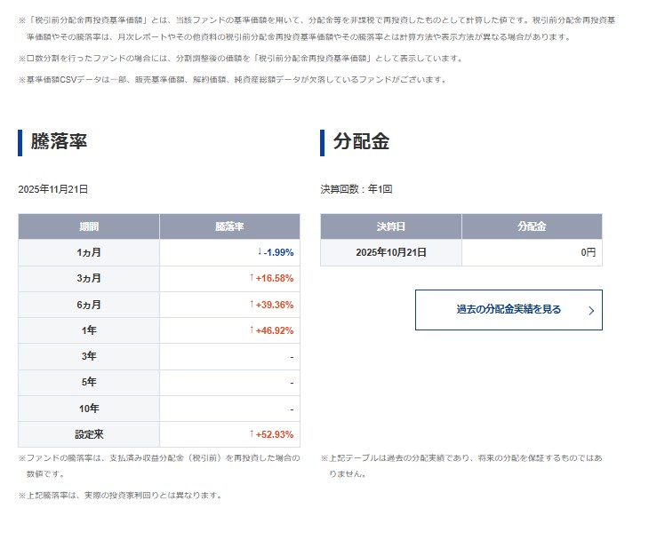 基準日2025年11月21日のデータになりますので参考にしてください。騰落率は、直近1年で+46.92%、設定来で+52.93%となります。