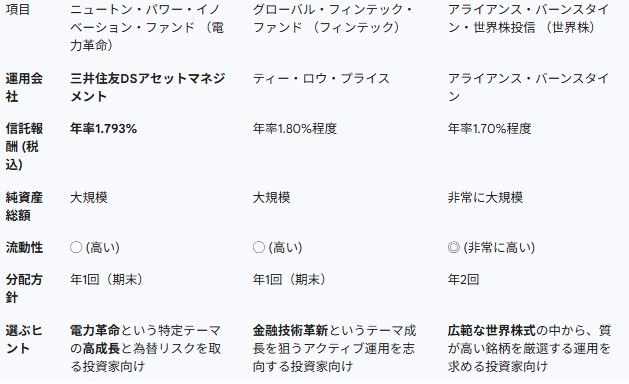 この表は、「ニュートン・パワー・イノベーション・ファンド」をはじめとする、グローバルなテーマを追う同種のアクティブファンドと比較をしたものです。信託報酬はどれも年率1.7%〜1.8%程度で、大きな差が無いように見えますが、あえて選ぶとすると投資テーマでしょうか。
