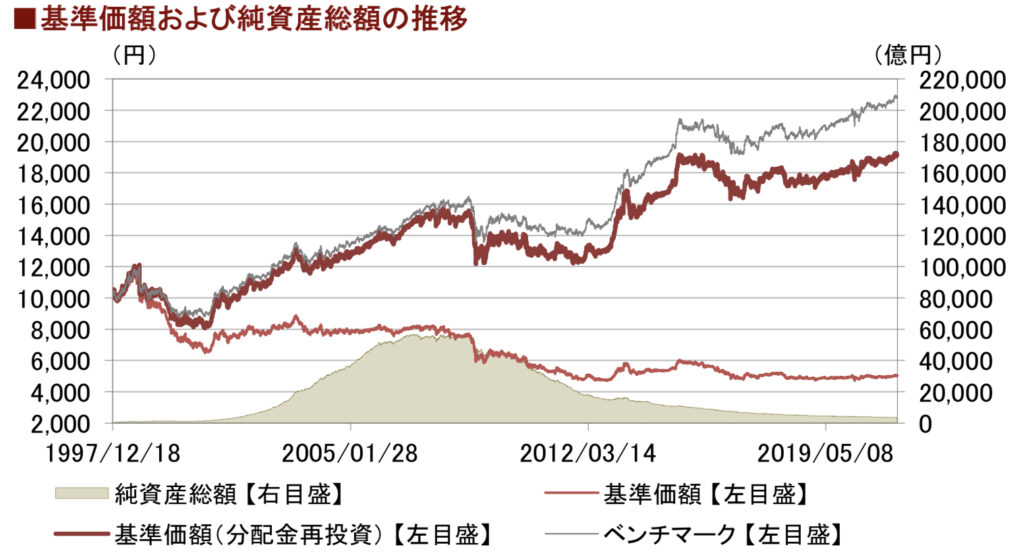 毎月の分配金を出した後の基準価額です。途中売却をしようとしたらこの価格で売却することになります。1997年募集当初10,000円で設定されたこの投信も2021年8月には5,033円とほぼ半額になっています。無理な毎月分配をし続けていたのがよくわかりますね。