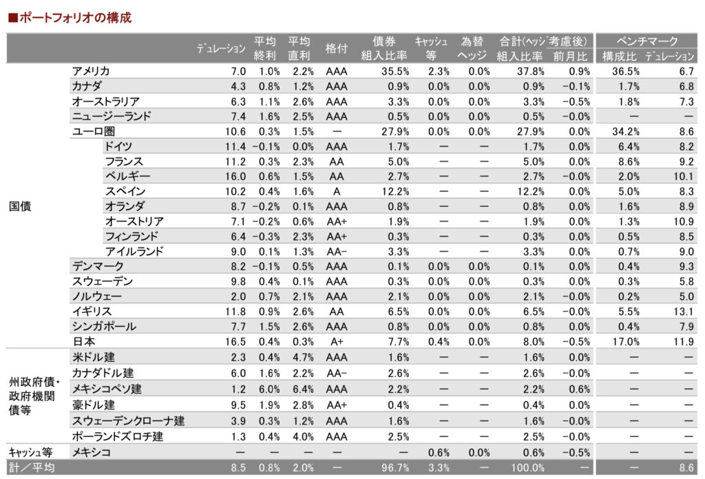 上の図からわかるように、アメリカ、イギリス、欧州主要国、豪州、NZ、カナダ、日本など誰でも知っている安心できる「先進国」の債券のみに投資をしています。格付ではAAA格が圧倒的に多く、破綻リスク(デフォルト)は極めて低いと言えます。