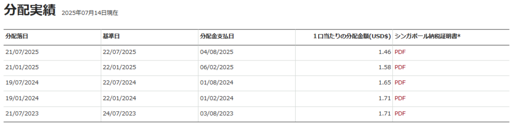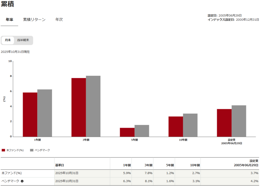 基準日2025年10月31日のデータでかつ、USDベース資料から抜粋になりますので参考にしてください。直近1年で+5.9%、3年で+7.8%の騰落率になります。年2回の分配金も出ています。また総経費率(コスト)は0.18%になっています。