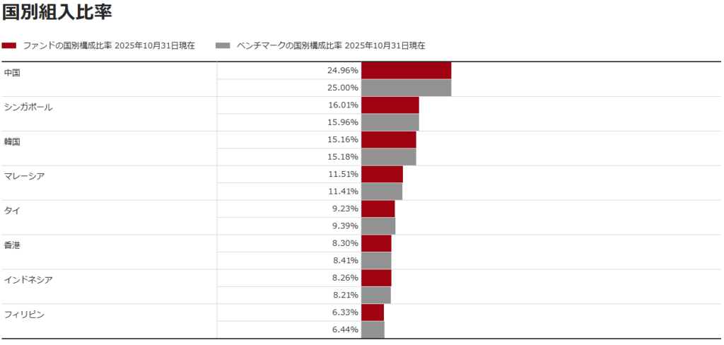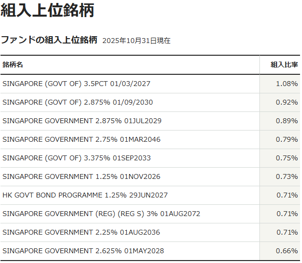 組み入れ上位はほとんどシンガポール政府発行の債券になっていますが、国別組入比率を見ると中国が約25%と投資割合が一番多くなっています。