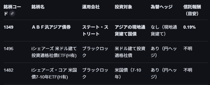 東証に上場する債券ETFでアジアの現地通貨建て国債に投資するETFは実質的にこのファンドしかなく、同種ETFは無いようです。