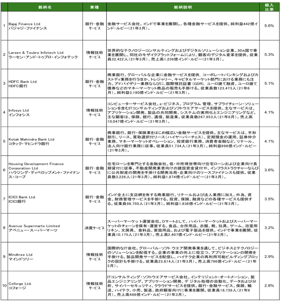 組入上位10銘柄を見てみても、私は知らない企業ばかりですwインド株勉強不足で、ほとんど知りませんが、銀行・金融が多いのが目立ちます。