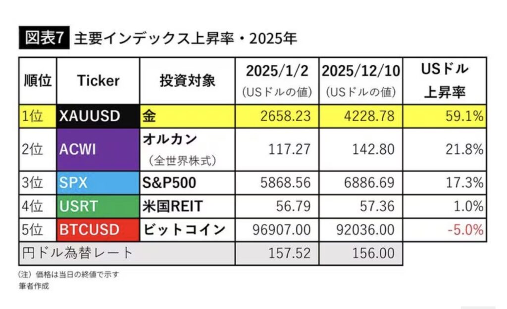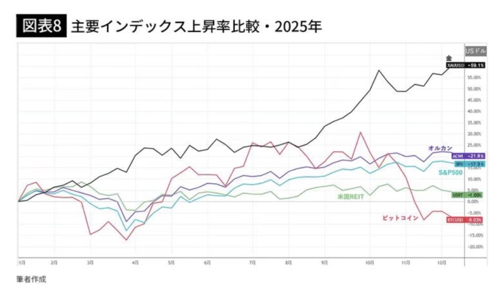 多くの個人投資家が信奉してきたオルカンやS&P500は確かに上昇した。しかし、**年間上昇率トップとなったのは株式ではなく金(ゴールド)**だった。