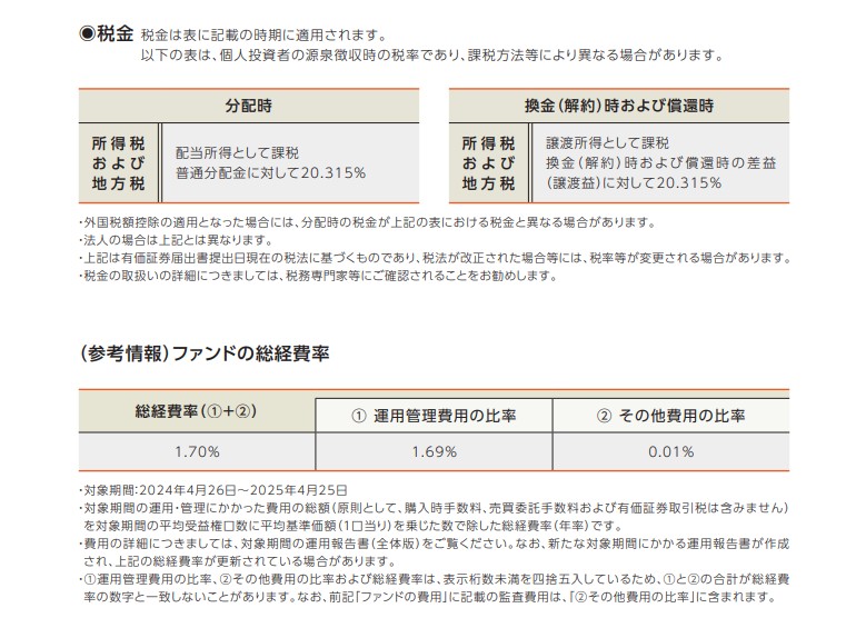 本ファンドの保有期間中にかかる運用管理費用(信託報酬)は年率1.694%(税込)で、諸経費を含めた総経費率は1.70%に達します。