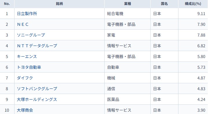 組入上位には日立製作所やNEC、トヨタ、大塚HDなど多岐にわたる業種が並んでいます。