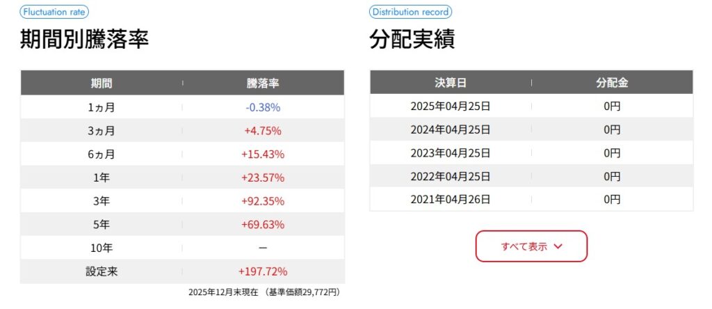 利益を分配せず再投資に回すことで効率的に基準価額を押し上げ、2025年10月には最高値30,958円を記録しました。